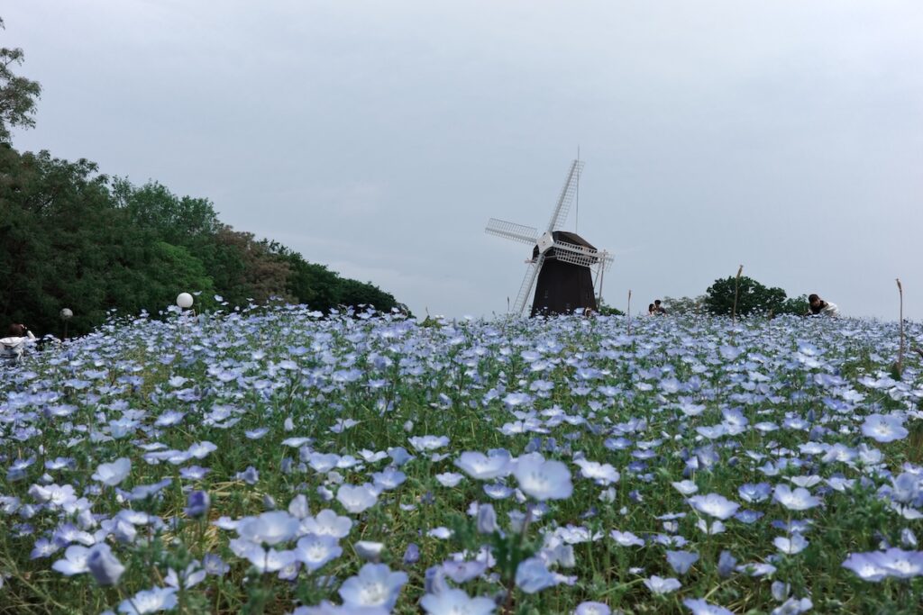 風車とネモフィラの組み合わせは風情があってとても素敵です。異国情緒が感じられて、別世界のよう。
